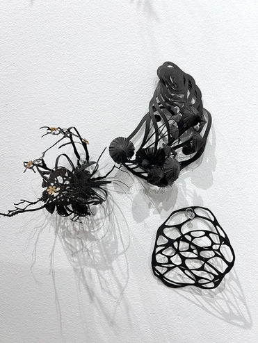 The "Origin" installation unfolds as a constellation of suspended forms that drift across the wall like fragments of thought made visible. Each intricate structure appears both organic and unstable—resembling cells, shells, or internal architectures—held together by delicate networks of cuts that echo the logic of memory itself. The stark contrast between black and white intensifies their presence, while the directional lighting casts elongated shadows that double each form, suggesting the layered nature of consciousness: what is seen and what lingers beneath.